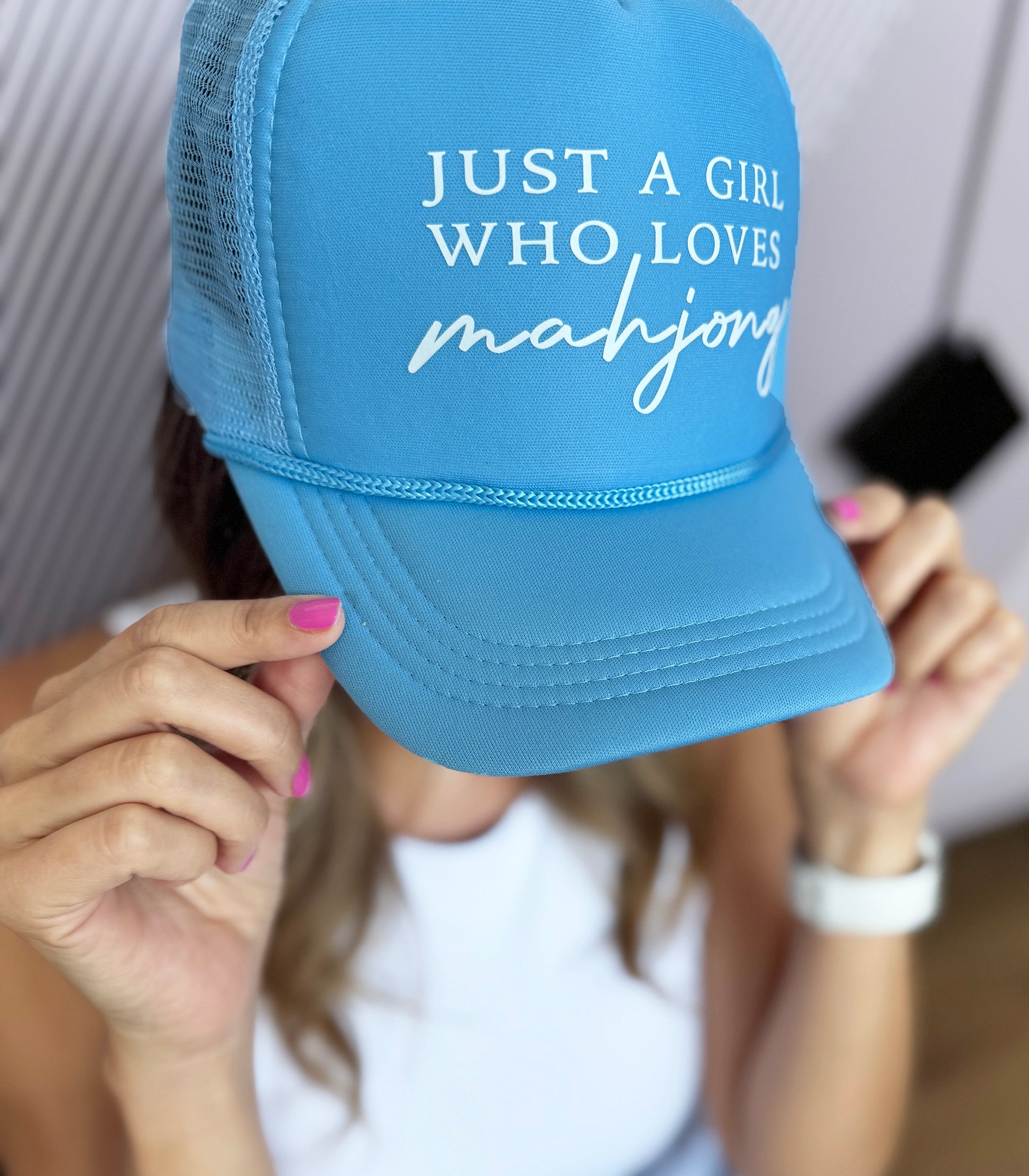 Wear your mahj heart on your head with our sky-blue Just a Girl Who Loves Mahjong cap. Featuring clean white text, a lightweight foam front, and airy mesh back, this adjustable trucker cap is made for sunshine, seaside games, and showing the world your favorite pastime.