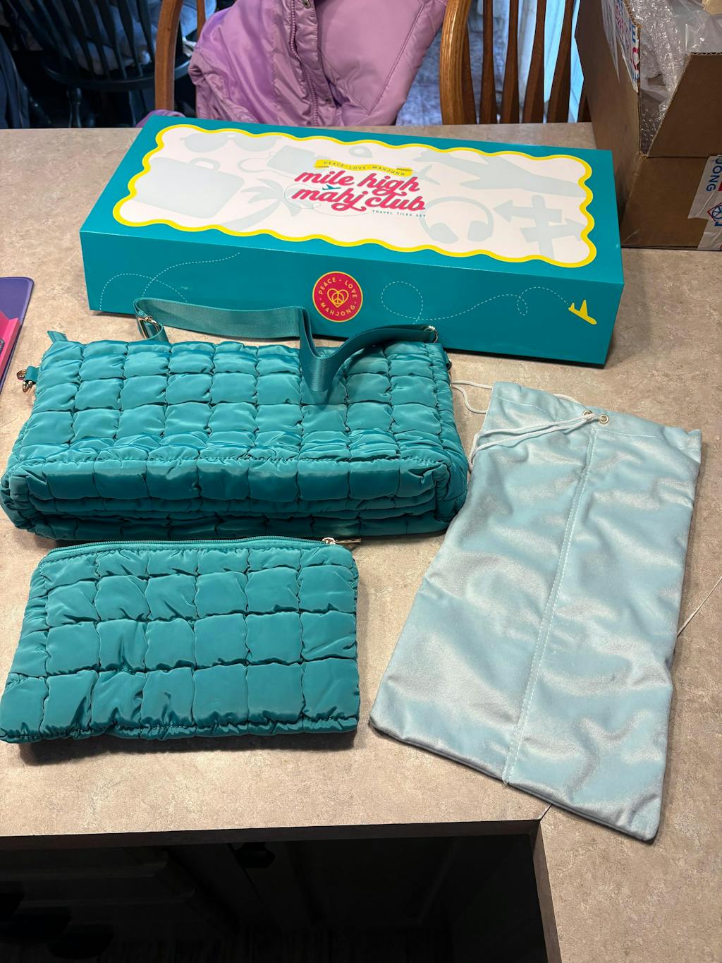 Stylish, compact, and ready for takeoff—our Mile High Mahj Club Travel Bags are the perfect companions for your travel tile set. This puffer-style duo includes a sleek crossbody bag (15" x 9" x 3") that fits your full set and accessories with ease, plus a matching zippered pouch (10" x 6") designed specifically to hold your tiles. Both bags feature secure zipper closures, lightweight padding, and major cute factor—so your mahjong game can travel in style, wherever you go.