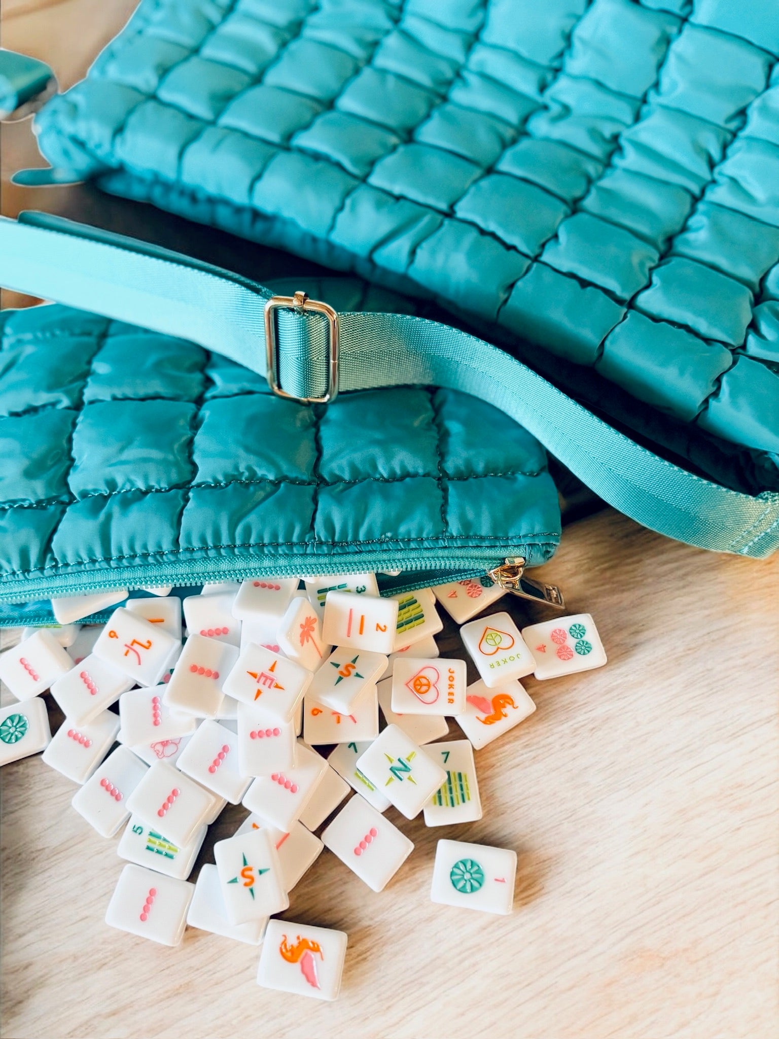 • Quilted puffer tile bag (aqua) to keep your tiles snug and secure (10"x 6")